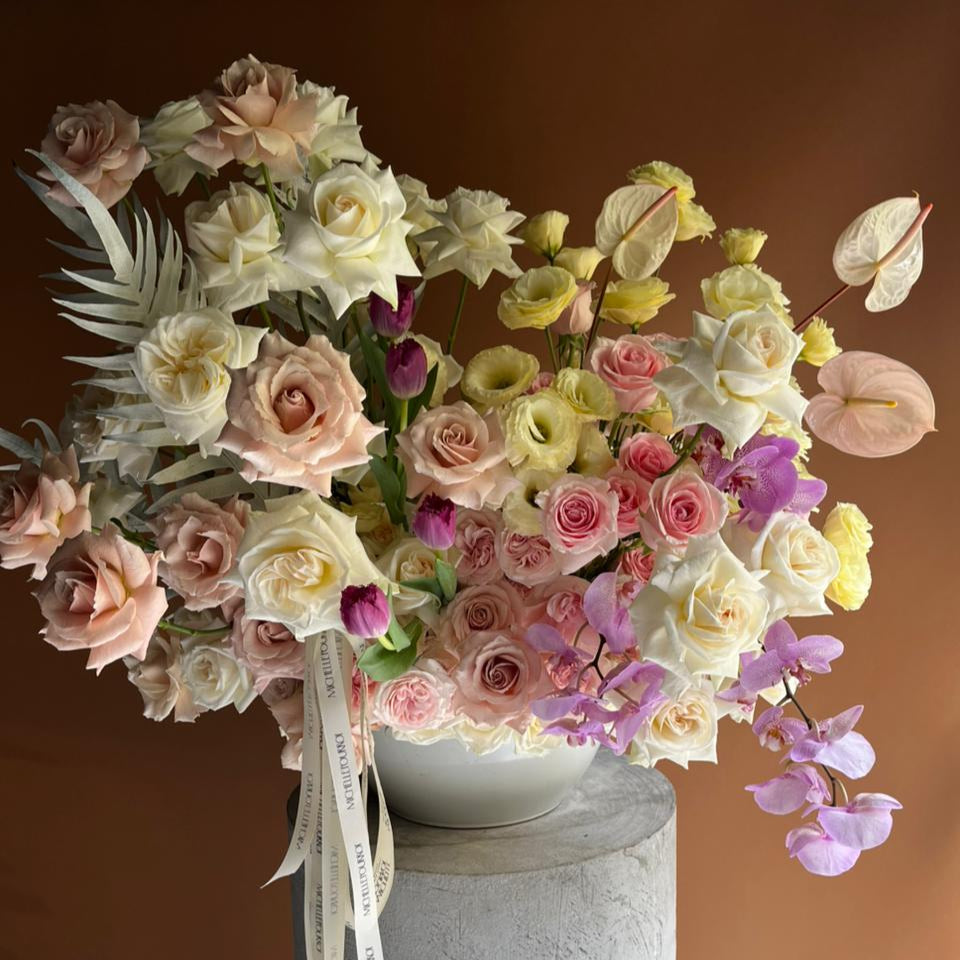 Este arreglo desborda encanto y color en una base de cerámica blanca con forma de tazón. Combina un mix armonioso de flores en suaves tonos pastel, realzado con un toque vibrante de tinto que le da vida y personalidad. Perfecto para añadir un guiño alegre y delicado a cualquier espacio. ¡Un detalle que invita a sonreír!