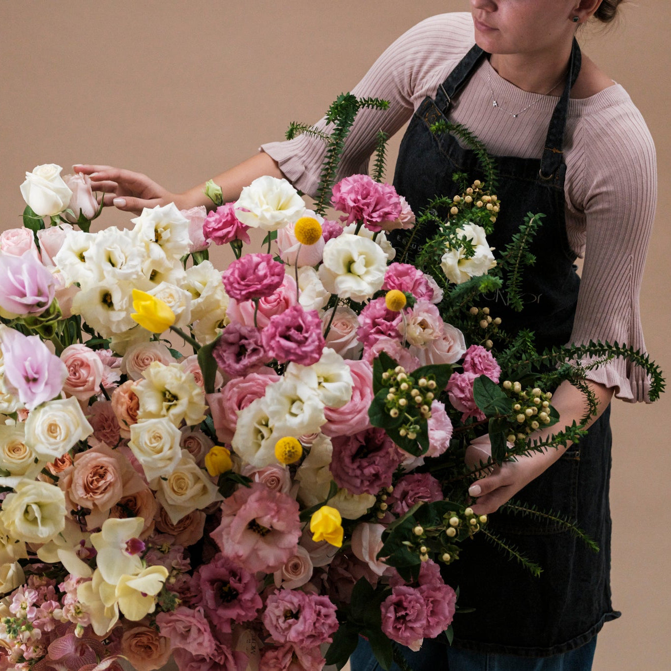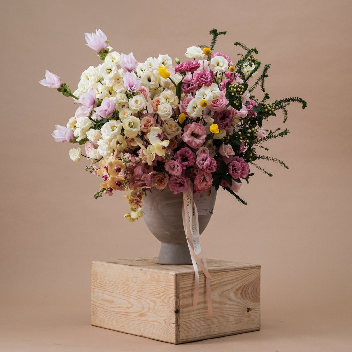 Arreglo XL de una sola vista con rosas, lisianthus, cúrcuma, tulipanes, hipericum y orquídea phalaenopsis.