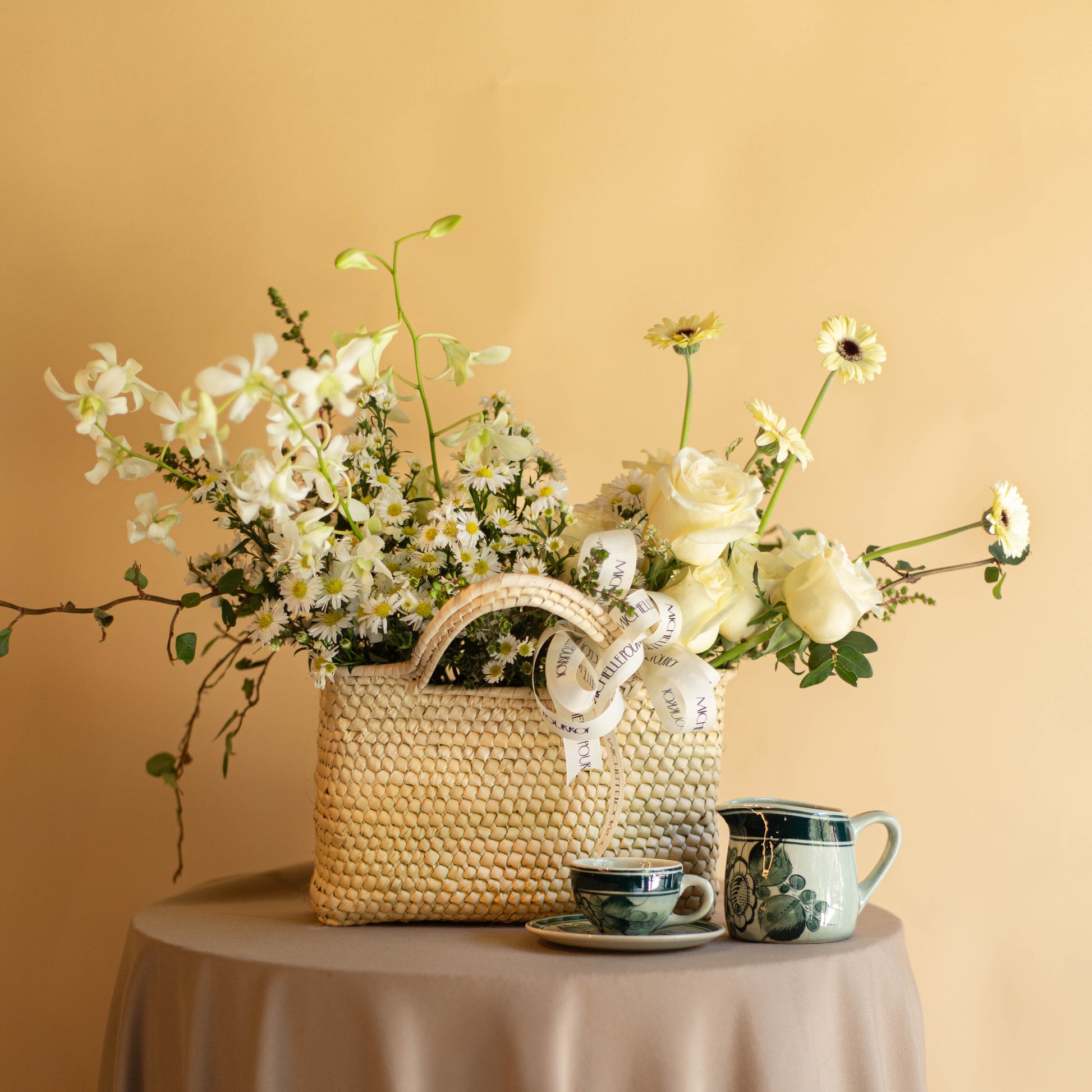 Canasta de rosa, montecasino, mini gerbera y orquídea.
