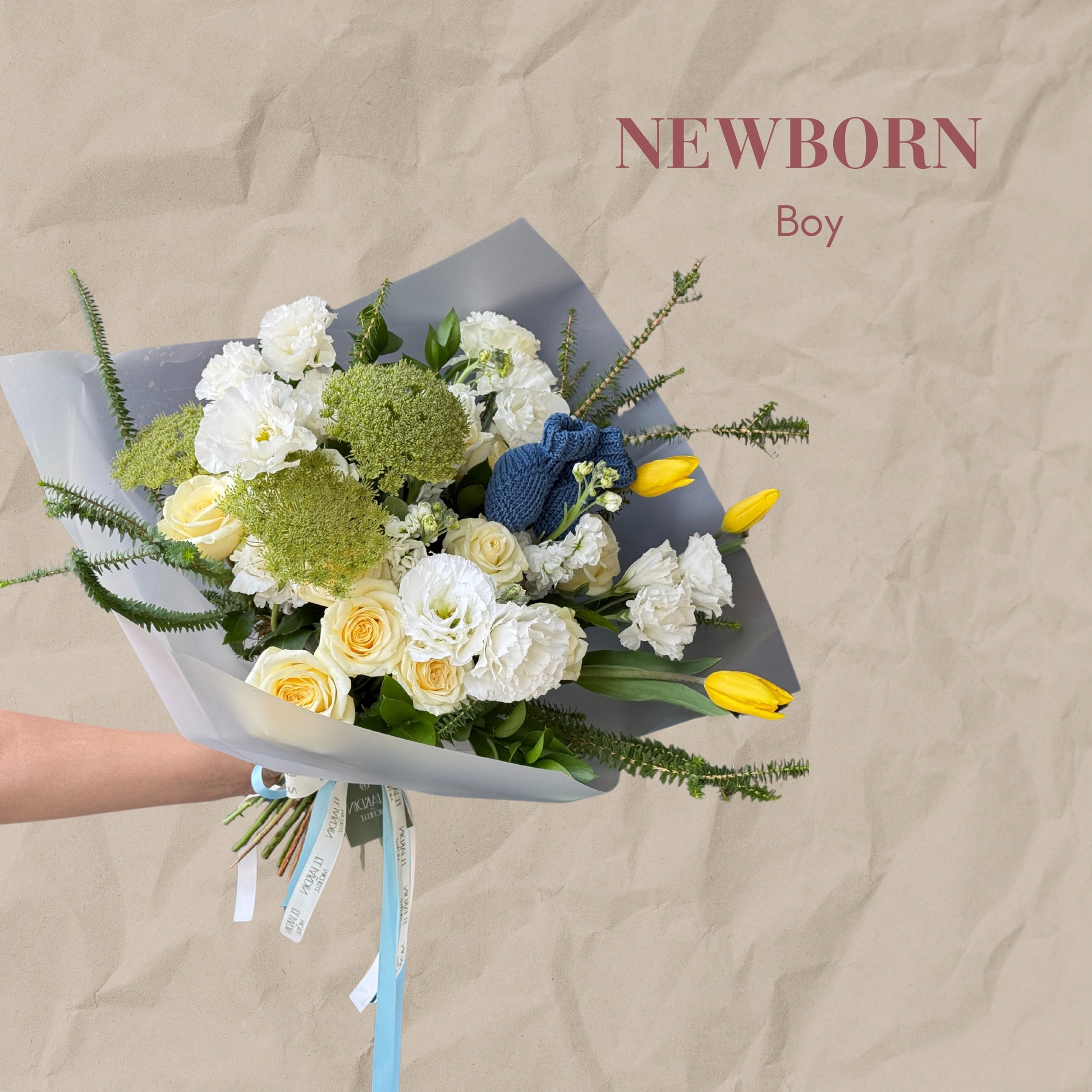 Un ramo delicado para celebrar la llegada de un nuevo bebé. Incluye flores frescas en tonos suaves y un par de zapatitos tejidos a mano, ideales para conservar como recuerdo. Disponible en versión niño (azul) y niña (rosa).