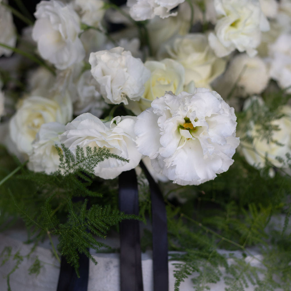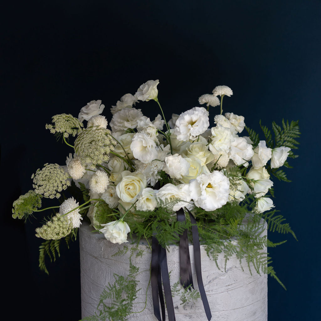 Este arreglo luctuoso en tonos blancos está diseñado para colocarse sobre una caja o pedestal, ofreciendo un tributo sencillo pero lleno de elegancia. Sus flores blancas transmiten serenidad y respeto, ideales para acompañar en momentos solemnes.
