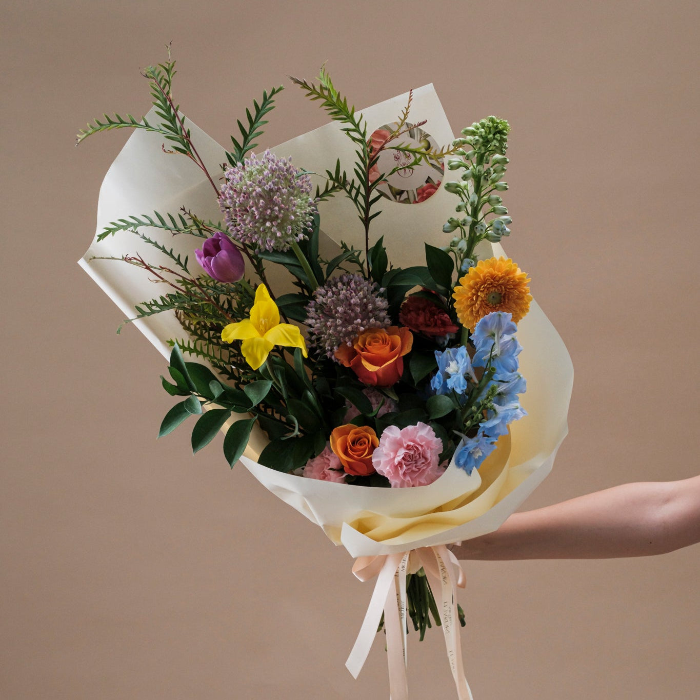 Bouquet de rosas, tulipanes, delphinium y gerberas, envuelto en papel coreano.