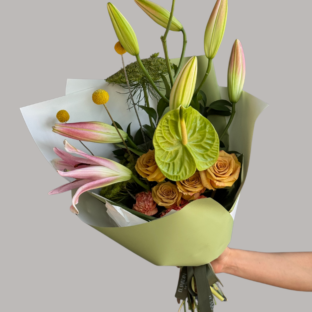 Cada ramo está diseñado a mano con flores frescas, cuidadosamente seleccionadas para esta ocasión.