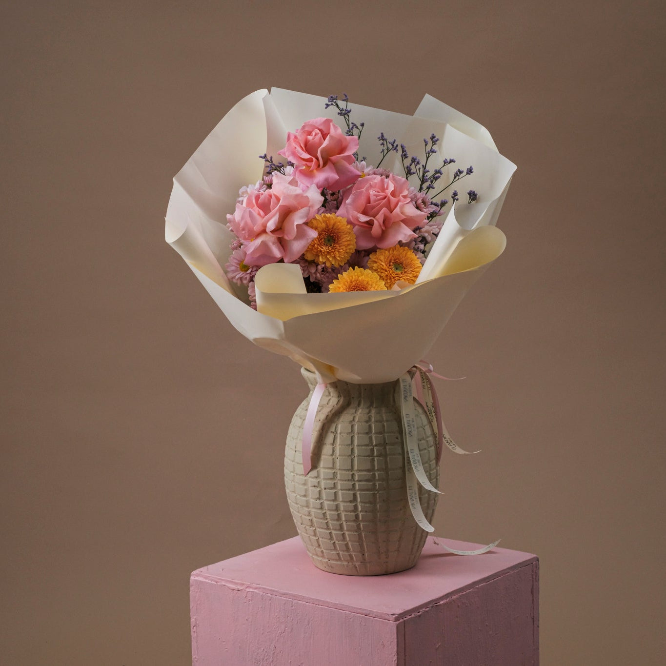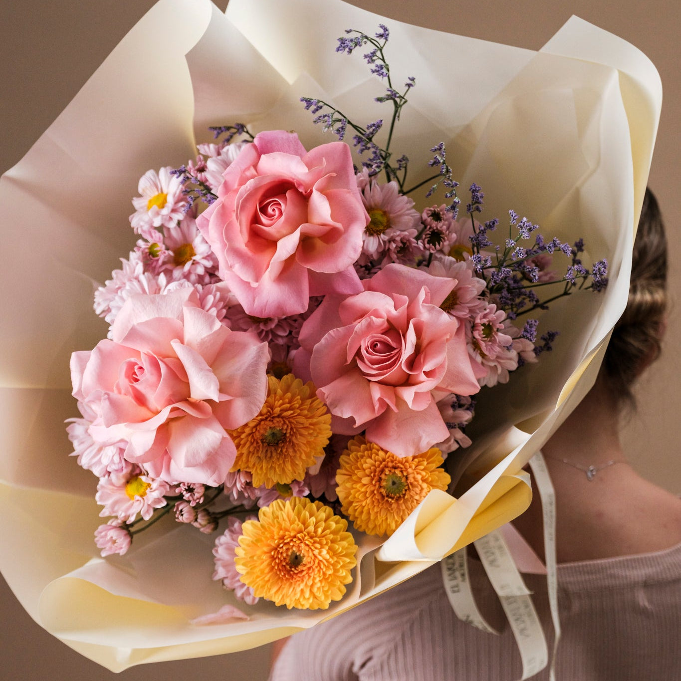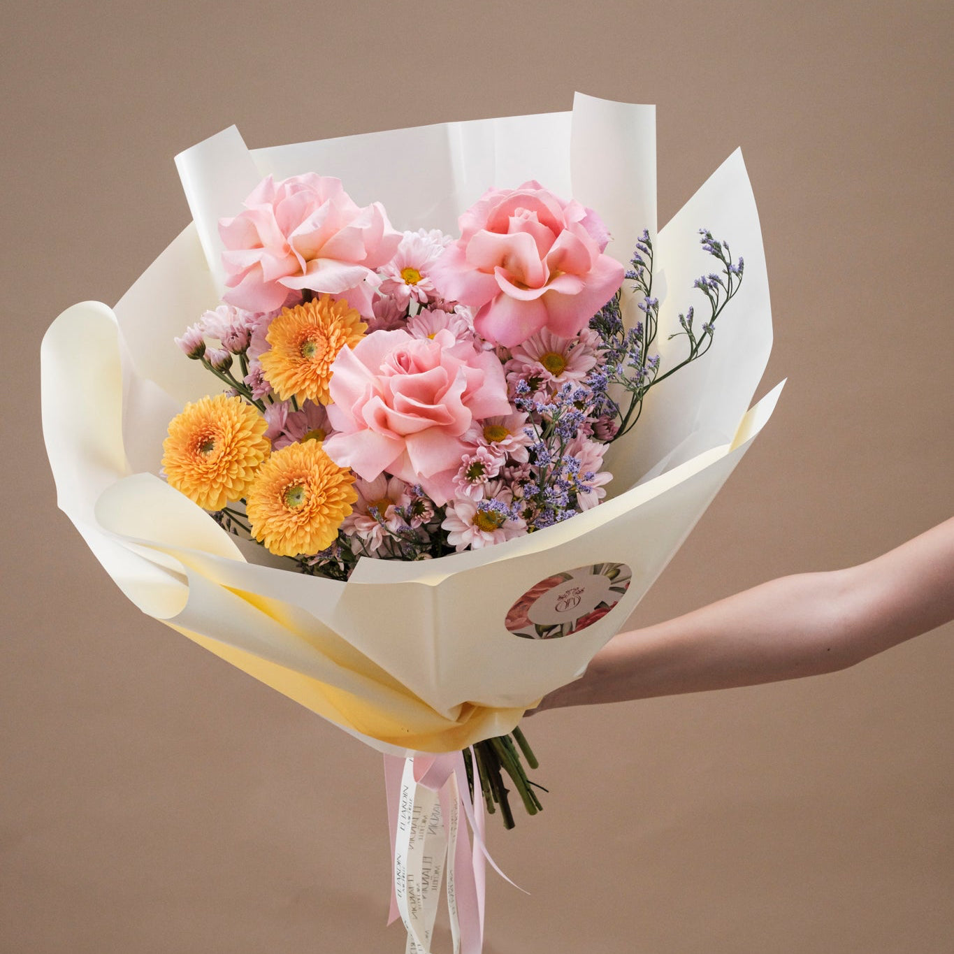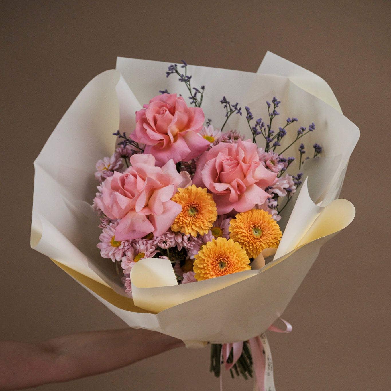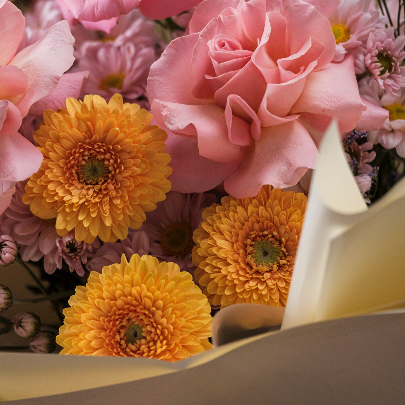 Bouquet de rosas pastel y gerberas, envuelto en papel coreano.
